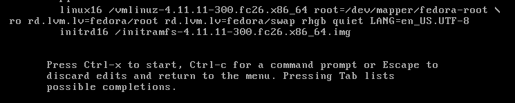 使用你的 del 键或你的 backspace 键,删除 rhgb quiet 并替换为以下内容: