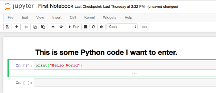 Jupyter Notebooks 的强大之处在于除了能够输入代码之外,你还可以用 Markdown 添加叙述性和解释性文本。我想添加一个标题,所以我在代码上面添加了一个单元格,并以 Markdown 输入了一个标题。当我按下 Ctrl+Enter 时,我的标题转换为 HTML。(LCTT 译注:或者可以按下 Run 按钮。)