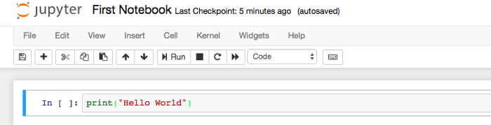 单元格周围的绿色高亮显示你处于编辑模式,蓝色高亮显示你处于命令模式。以下笔记本处于命令模式并准备好执行单元中的 Python 代码。注意,我已将笔记本的名称更改为 “First Notebook”。