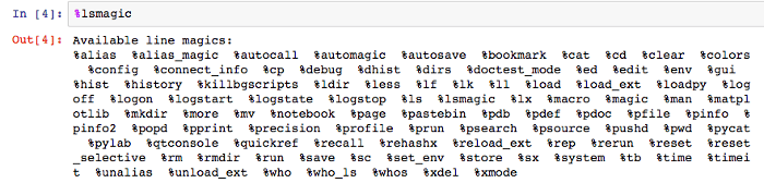 我也可以利用 IPython 的 line magic 和 cell magic 命令。你可以通过在代码单元内附加 % 或 %% 符号来列出魔术命令。例如,%lsmagic 将输出所有可用于 Jupyter notebooks 的魔法命令。