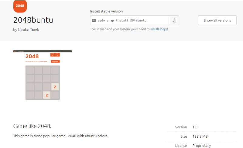 我注意到的另一件事是软件的大小。2048buntu 的 1.0 版本大小将近 140 MB。一个简单的游戏怎么需要这么多的空间?有用 Javascript 写的浏览器版本大概只用了不到它的四分之一。其他 snap 应用商店的 2048 游戏的大小没有一个达到了这个软件的一半。