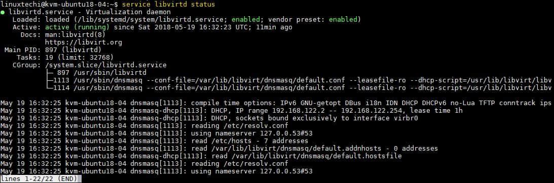 linuxtechi@kvm-ubuntu18-04:~$ sudo service libvirtd start