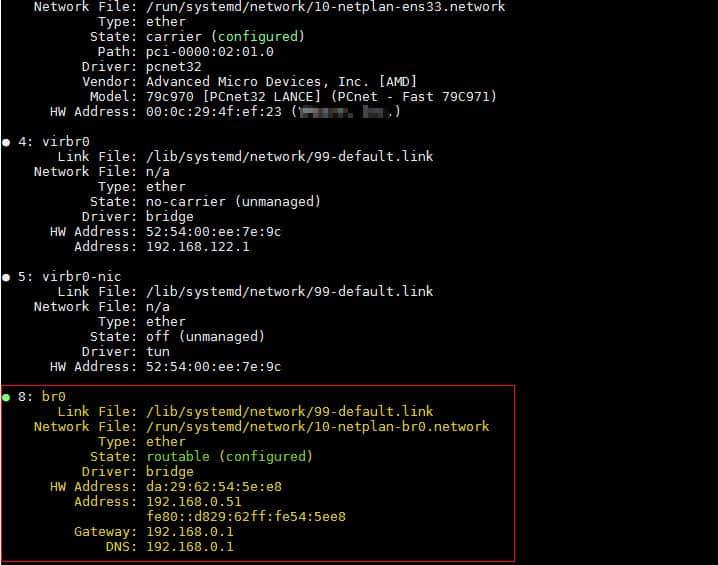 正如你所看到的,我们已经从接口(ens33)中删除了 IP 地址,并将该 IP 添加到 br0 中,并且还将接口(ens33)添加到 br0。使用下面的 netplan 命令使更改生效,