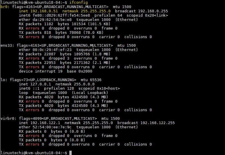 linuxtechi@kvm-ubuntu18-04:~$ ifconfig