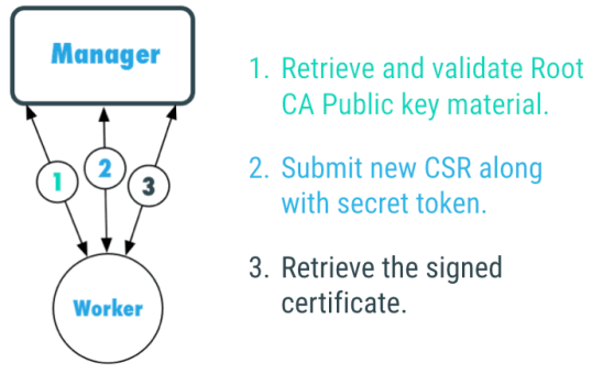 要接收它们的证书而无需共享它们的私钥,新的主机通过发布一个证书签名请求(CSR)来开始,管理者收到证书签名请求之后,转换成一个证书。这个证书成为这个新的主机的身份标识,使这个节点成为 Swarm 的一个完全合格成员!