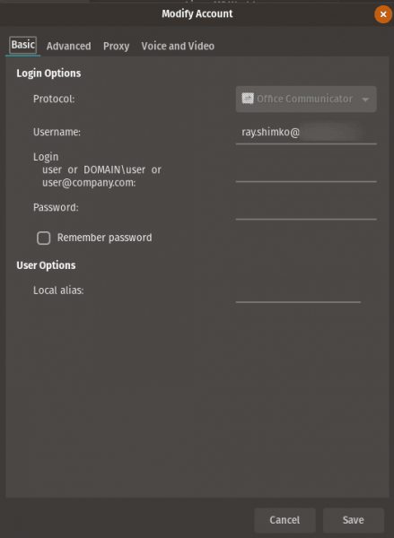 首次启动 Pidgin 时,点击 “Add” 添加一个新帐户。在基本选项卡(如下截图所示)中,选择 “Protocol” 下拉菜单中的 “Office Communicator”,然后在 “Username” 字段中输入你的“公司电子邮件地址”。