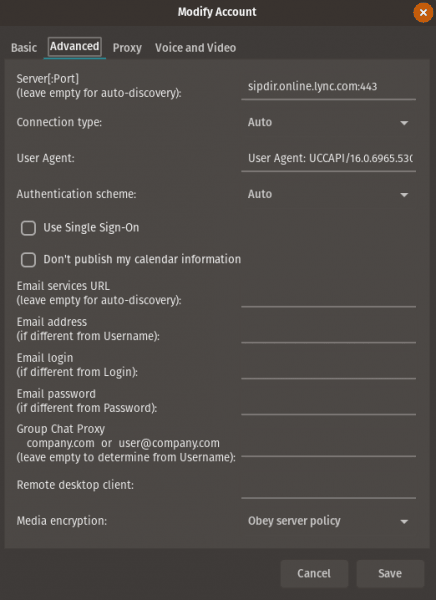 接下来,点击高级选项卡。在 “Server[:Port]” 字段中输入 “sipdir.online.lync.com:443”,在 “User Agent” 中输入 “UCCAPI/16.0.6965.5308 OC/16.0.6965.2117”。