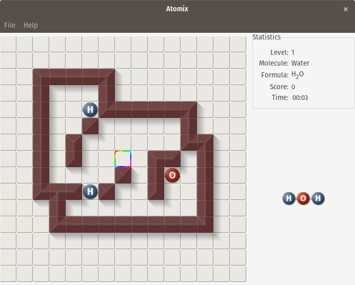 Atomix 是 1990 年在 Amiga、Commodore 64、MS-DOS 和其他平台发布的 Atomix 益智游戏的开源克隆。Atomix 的目标是通过连接原子来构建原子分子。单个原子可以向上、向下、向左或向右移动,并一直朝这个方向移动,直到原子撞上一个障碍物——水平墙或另一个原子。这意味着需要进行规划,以确定在水平上构建分子的位置,以及移动单个部件的顺序。第一关是一个简单的水分子,它由两个氢原子和一个氧原子组成,但后来的关卡是更复杂的分子。
