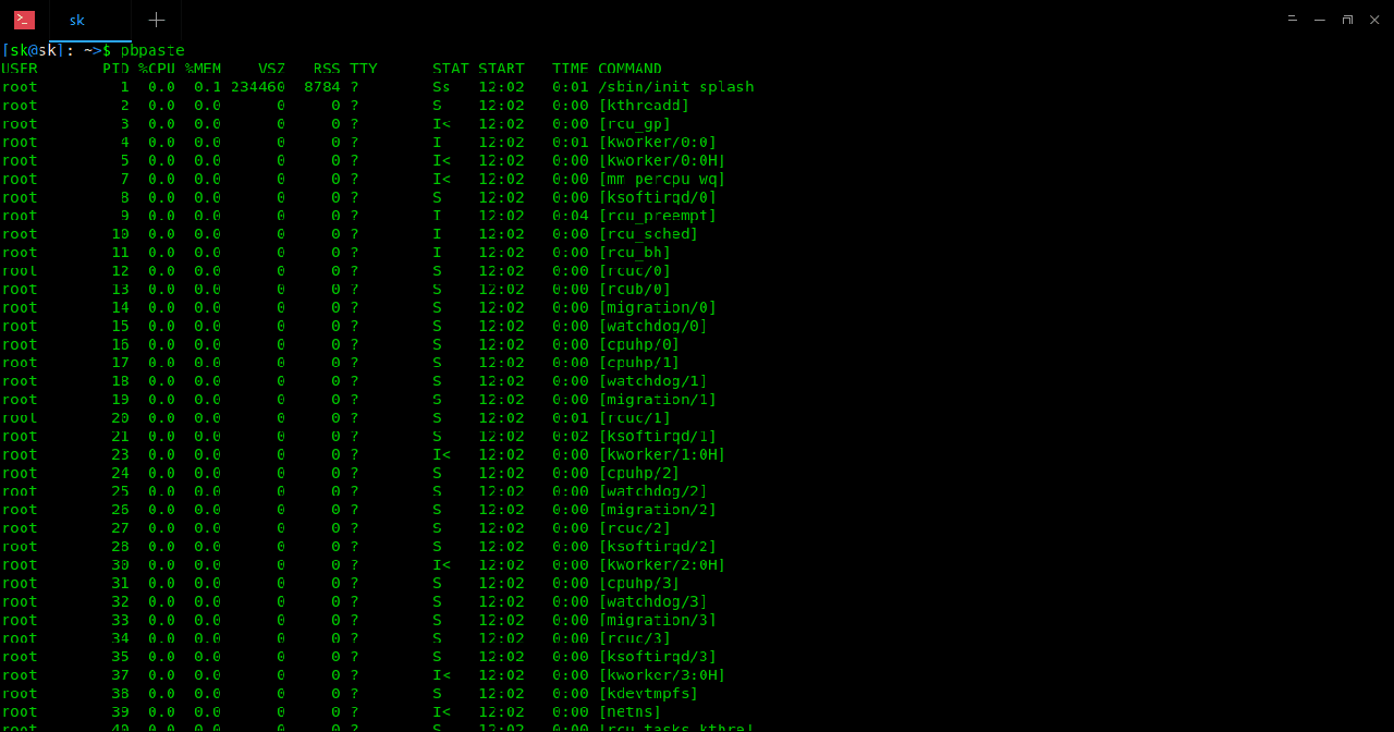 现在,输入 pbpaste 命令以显示剪贴板中 ps aux 命令的输出。