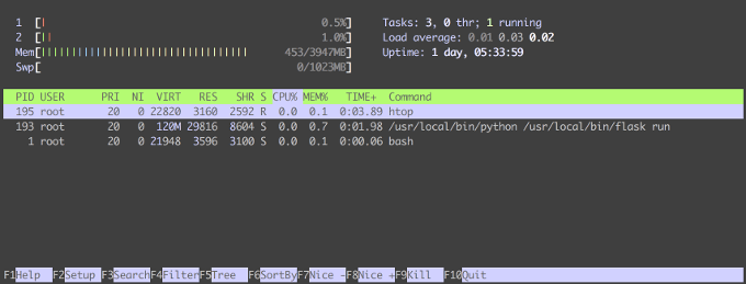 top - 08:31:32 up 1 day, 4:09, 0 users, load average: 0.20, 0.12, 0.10 Tasks: 3 total, 1 running, 2 sleeping, 0 stopped, 0 zombie %Cpu(s): 0.5 us, 0.3 sy, 0.0 ni, 99.2 id, 0.0 wa, 0.0 hi, 0.0 si, 0.0 st KiB Mem: 4042284 total, 2523744 used, 1518540 free, 263776 buffers KiB Swap: 1048572 total, 0 used, 1048572 free. 1804264 cached Mem PID USER PR NI VIRT RES SHR S %CPU %MEM TIME+ COMMAND 1 root 20 0 21964 3632 3124 S 0.0 0.1 0:00.23 bash 193 root 20 0 123520 29636 8640 S 0.0 0.7 0:00.58 flask 195 root 20 0 23608 2724 2400 R 0.0 0.1 0:00.21 top