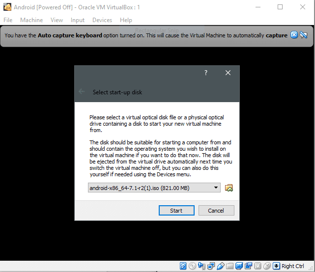首次启动 VM 虚拟机,VirtualBox 会提示你需要提供启动媒介,选择之前下载好的Android 镜像。
