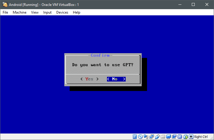 我们选择 C 开头选项,在虚拟盘中创建分区。官方不推荐使用 GPT 格式,所以我们选择 “No” 并按回车键。