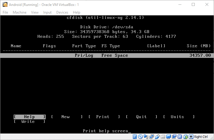 分区是通过文本界面操作,并没有友好的 GUI 界面,所以每个操作都需要小心对待。例如,在第一屏中还没有创建分区并且只检测到原始(虚拟)硬盘时显示如下。
