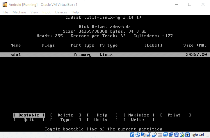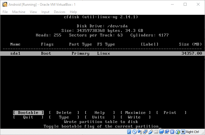 这个分区就是 Android 系统所在的分区,所以需要它是可启动的。选择 “Bootable”,然后按回车键(上方表格中 “Flags” 标志下面会出现 “boot” 标志),进一步,选择 “Write” 选项,保存刚才的操作记录并写入分区表。