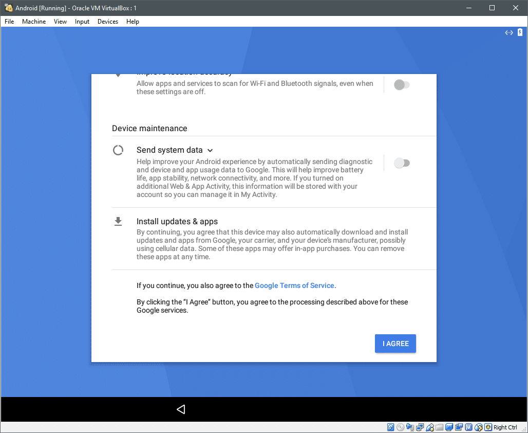 还有一些其他的选项,和让你设置一个新的 Android 设备类似。选择 “I Agree” 选项同意有关更新、服务等的相应的选项,当然谷歌的服务条款是不得不同意的。