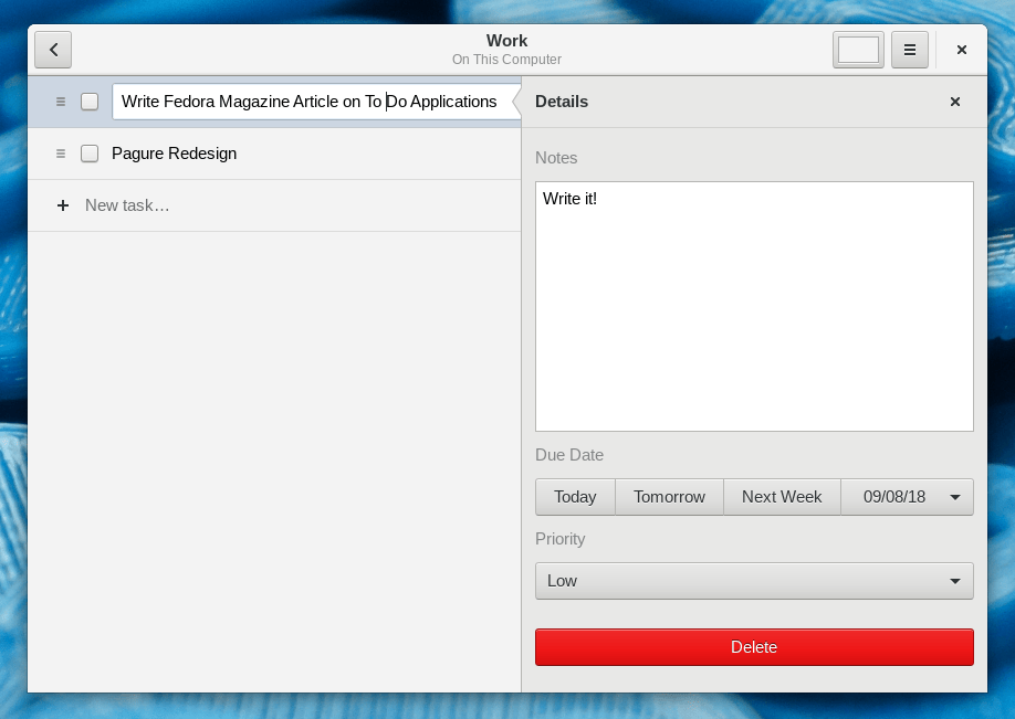 GNOME To Do 是专为 GNOME 桌面(Fedora Workstation 的默认桌面)设计的个人任务管理器。GNOME To Do 与其他程序进行比较,它有一系列简洁的功能。