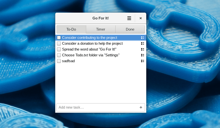Go For It! 是一个超级简单的任务管理程序。它能简单地创建一个任务列表,并在完成后标记它们。它不能将任务分组,也不能创建子任务。Go For It! 默认将任务存储为 todo.txt 格式,这能更方便地同步到在线服务或者其他程序中。额外地,Go For It! 包含了一个简单定时器来追踪你在当前任务花费了多少时间。