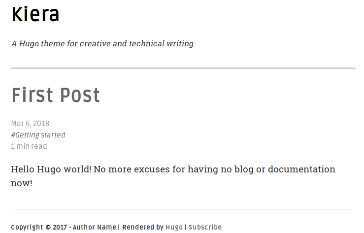 当你启动你的服务器并输入:http://localhost:1313/,你将会看到你的博客。(访问我 Gihub 主页上的 例子 )如果你想让文章的菜单栏和 Github 相似,给 themes/kiera/static/css/styles.css 打上这个 补丁
