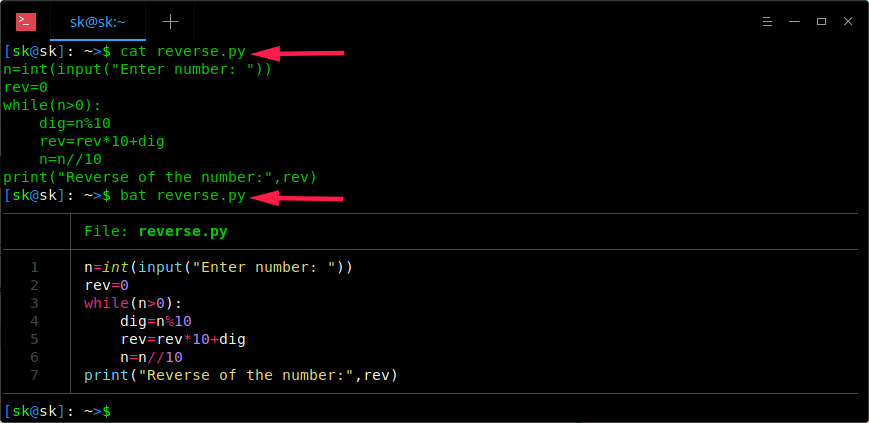 bat 命令支持大多数编程和标记语言的 语法高亮 。比如,下面这个例子。我将使用 cat 和 bat 命令来展示 reverse.py 的内容。