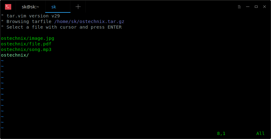 vim 不只是一个编辑器,使用它我们可以干很多事情。下面的命令展示的是在没有解压的情况下使用 vim 查看一个压缩的归档文件的内容: