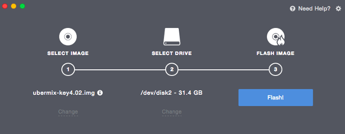 单击 “Select Image”。在本例中,我想创建一个可启动的 USB 盘,以便在新计算机上安装 Ubermix。在我选择了我的 Ubermix 镜像文件并将我的 USB 盘插入计算机,Etcher.io “看到”了驱动器,我就可以开始在 USB 上安装 Ubermix 了。