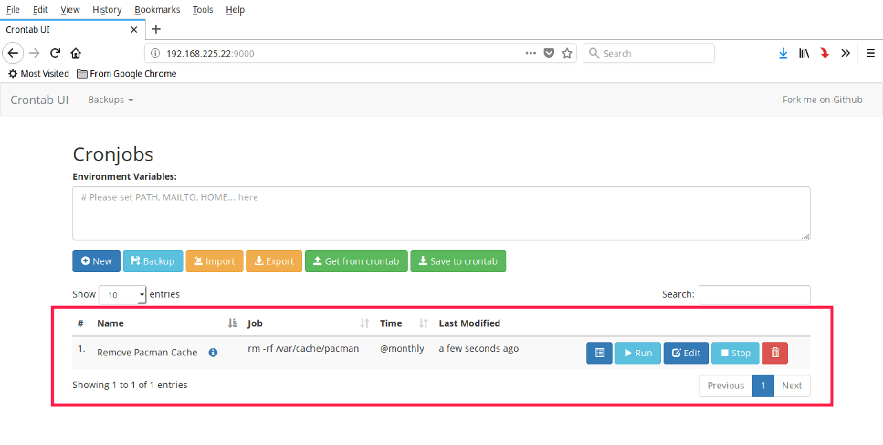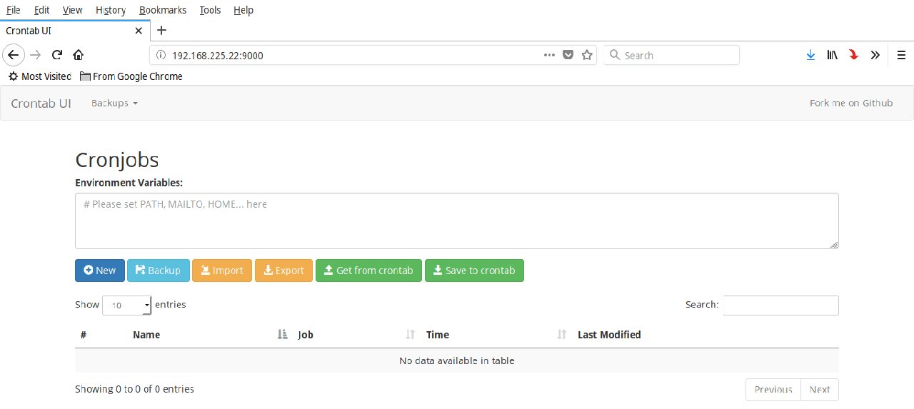 你可能在使用 Crontab UI 之前就已经使用 crontab 命令创建过 Cron 定时任务。如果是这样,你可以点击控制台页面上的 “Get from crontab” 按钮来获取已有的 Cron 定时任务。