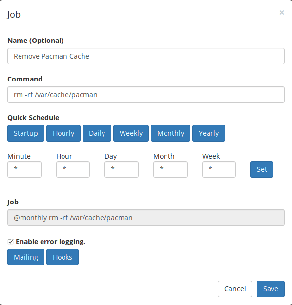 $ cat Downloads/crontab.db {"name":"Remove Pacman Cache","command":"rm -rf /var/cache/pacman","schedule":"@monthly","stopped":false,"timestamp":"Thu Aug 23 2018 10:34:19 GMT+0000 (Coordinated Universal Time)","logging":"true","mailing":{},"created":1535020459093,"_id":"lcVc1nSdaceqS1ut"}