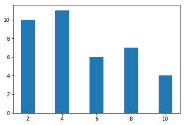 #导入 Matplotlib 库 from matplotlib import pyplot as plt #和 import matplotlib.pyplot as plt 一样 #生成 x 轴的数值 x = [2, 4, 6, 8, 10] #生成 y 轴的数值 y = [10, 11, 6, 7, 4] #调用函数来绘制柱状图 plt.bar(x,y) #显示图表 plt.show()