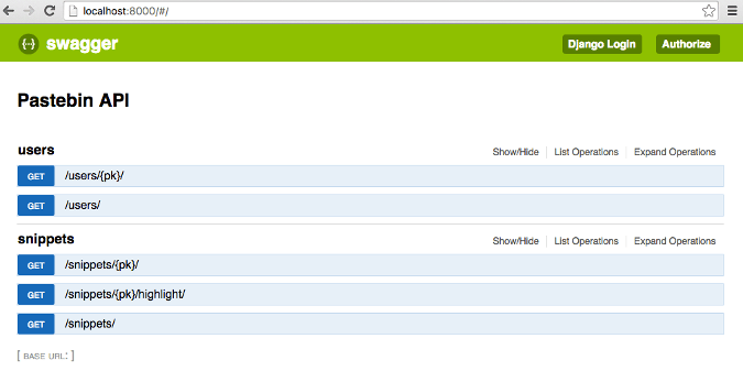 API 的用户界面按照 app 的维度展示了所有端点和可用方法,并列出了这些端点的可用操作,而且它提供了和 API 交互的功能(比如添加/删除/获取记录)。django-rest-swagger 从 API 视图中的 docstrings 生成每个端点的文档,通过这种方法,为你的项目创建了一份 API 文档,这对你,对前端开发人员和用户都很有用。