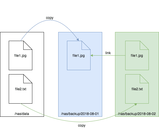 pi@raspberrypi:~ $ rsync -a --link-dest /nas/backup/2018-08-01/ /nas/data/ /nas/backup/2018-08-02