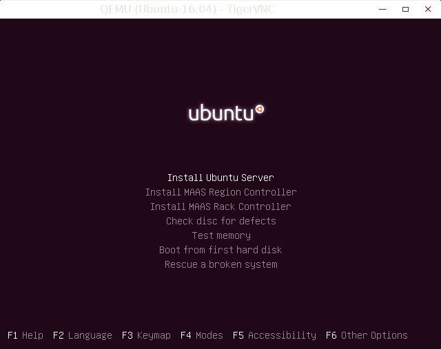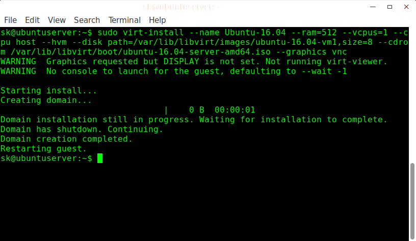 $ sudo virt-install --name Ubuntu-16.04 --ram=512 --vcpus=1 --cpu host --hvm --disk path=/var/lib/libvirt/images/ubuntu-16.04-vm1,size=8 --cdrom /var/lib/libvirt/boot/ubuntu-16.04-server-amd64.iso --graphics vnc