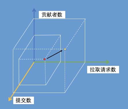 如果以三维空间来描述一个项目的活跃度,以提交数、拉取请求数、贡献者数为三维,可以确定在某个时间点某个项目的坐标,那么计算一段时间内,该坐标点的移动轨迹和速率,可以真实的反映该项目的活跃度趋势。