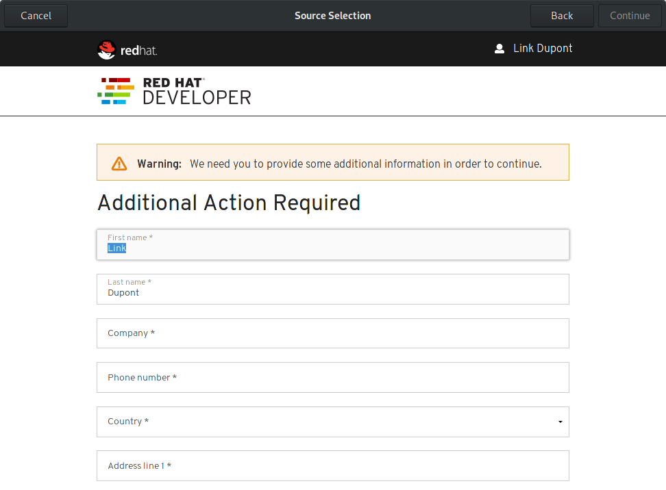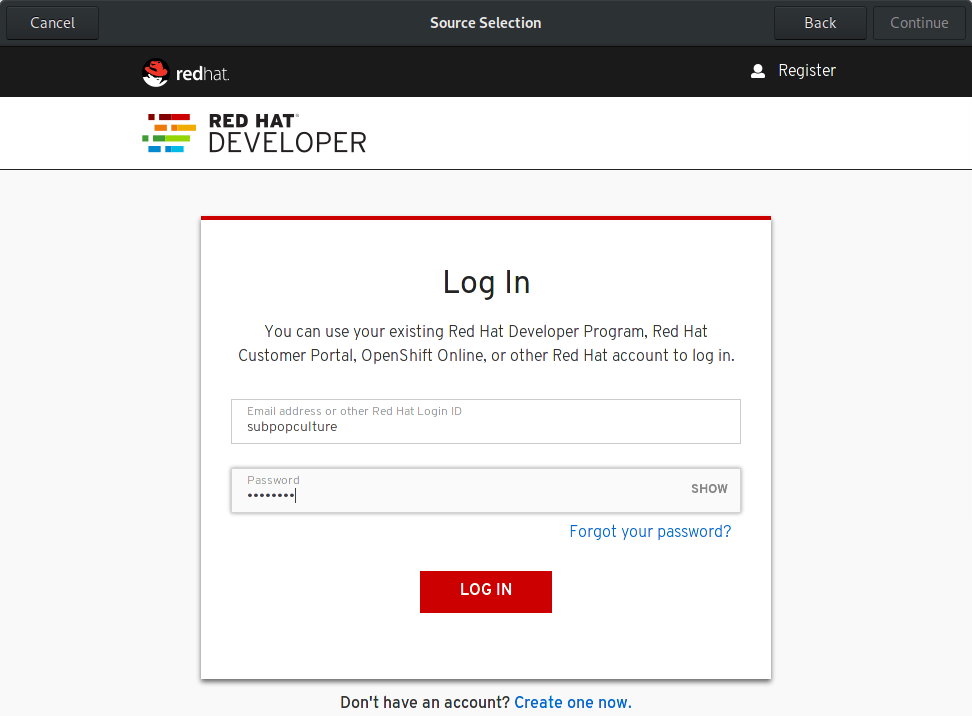 单击“注册”按钮,然后按照注册助手中的步骤操作。 出现提示时,使用你的红帽开发者帐户登录。