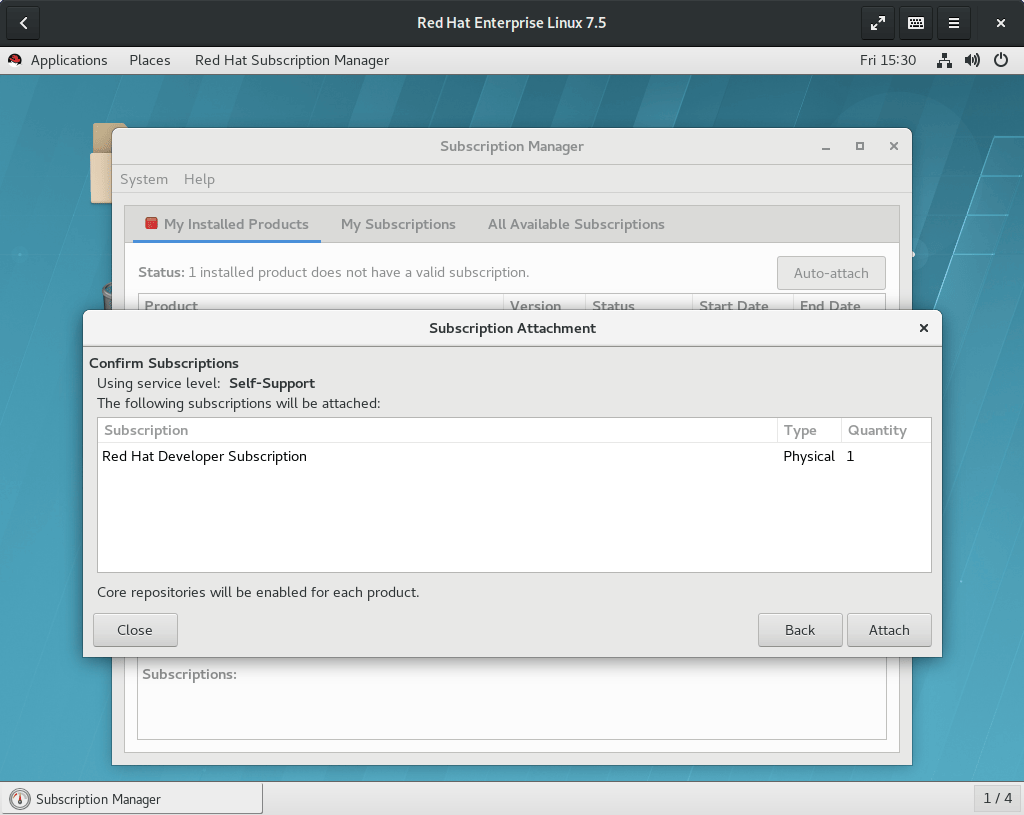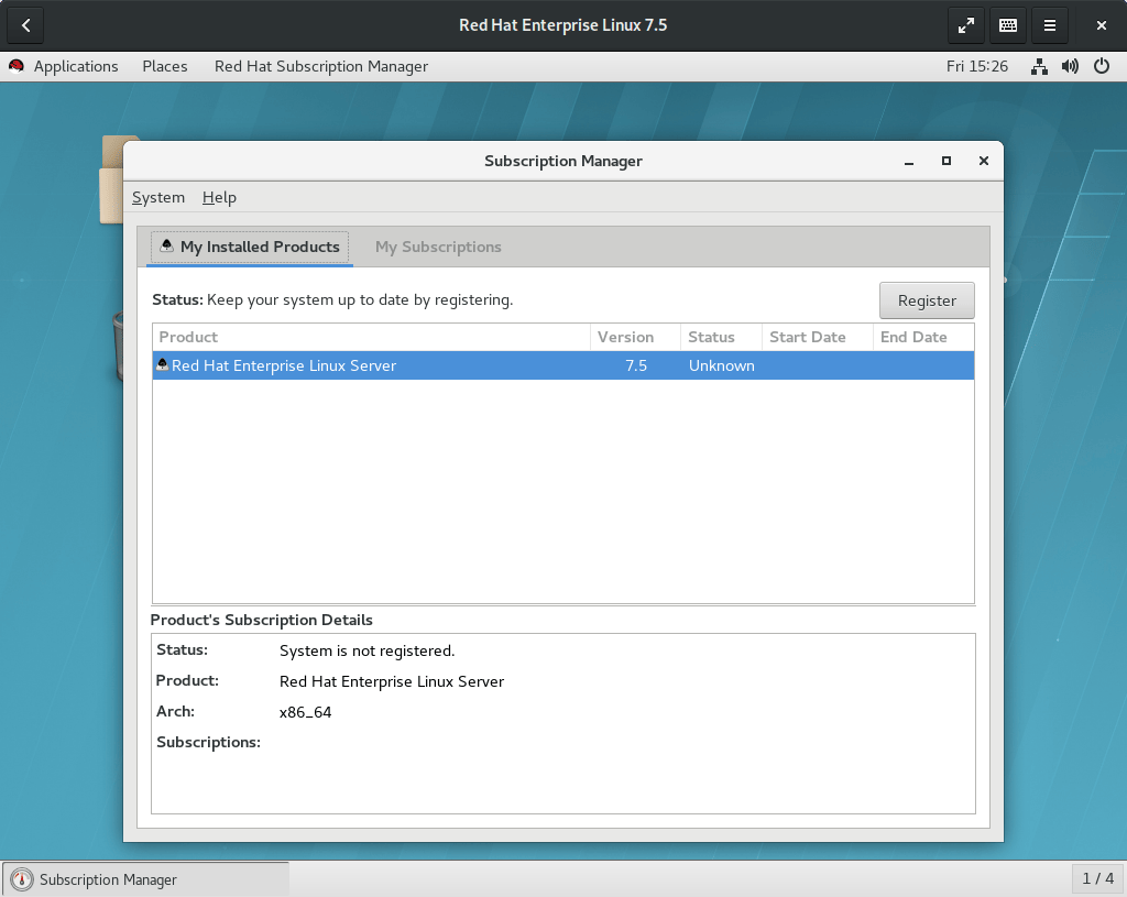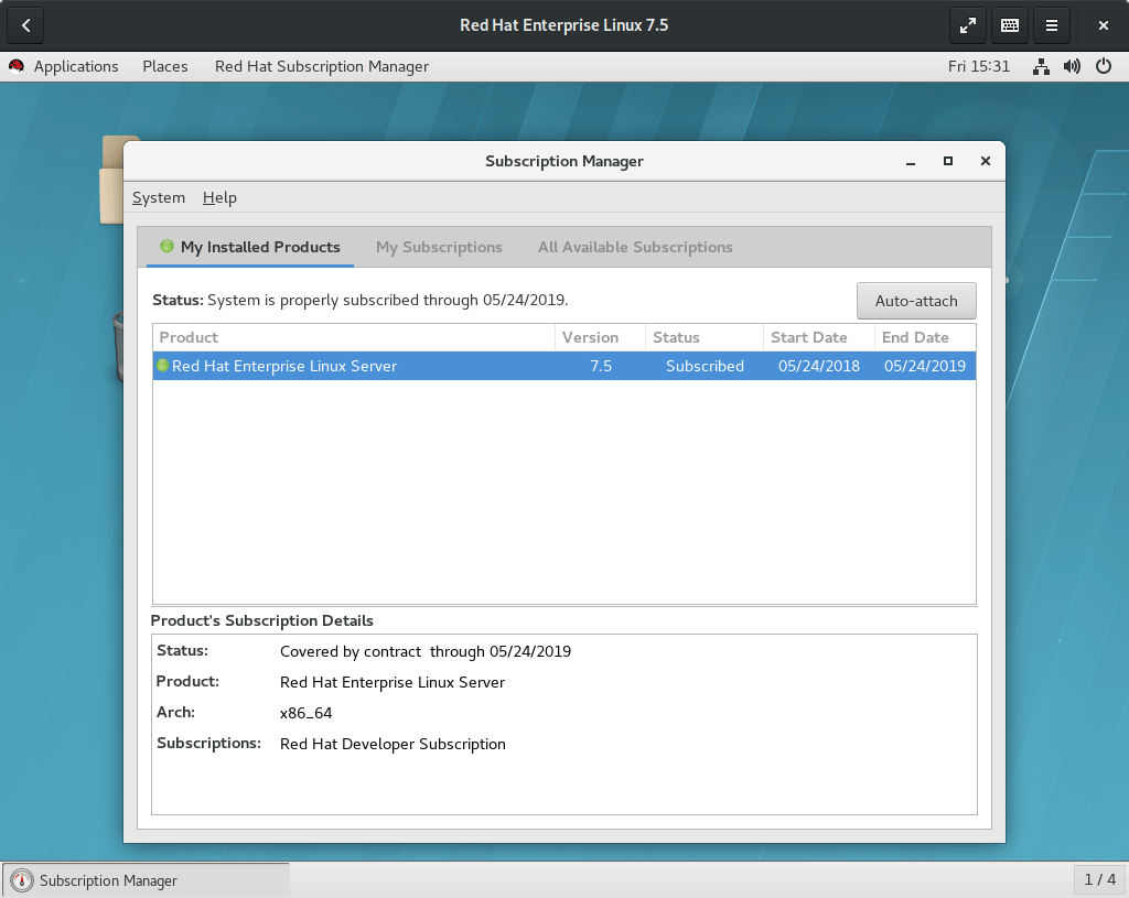 等到安装结束,虚拟机会直接重启并登录到桌面。在虚拟机里,在应用菜单的“系统工具”一栏启动“红帽订阅管理”。这一步需要输入 root 密码。