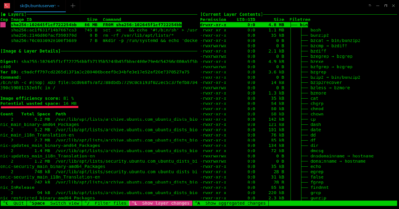 正如你在上面的截图中看到的那样,在终端的左边一栏列出了给定 Docker 镜像的各个层及其详细内容,浪费的空间大小等信息。右边一栏则给出了给定 Docker 镜像每一层的内容。你可以使用 Ctrl+空格 来在左右栏之间切换,使用 UP/DOWN 光标键来在目录树中进行浏览。