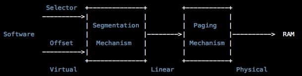 在 x86 的专用术语中,一个 虚拟地址 virtual address 是由一个段选择器和在段中的偏移量组成。一个 线性地址 linear address 是在页面转换之前、段转换之后得到的一个地址。一个 物理地址 physical address 是段和页面转换之后得到的最终地址,它最终将进入你的物理内存中的硬件总线。