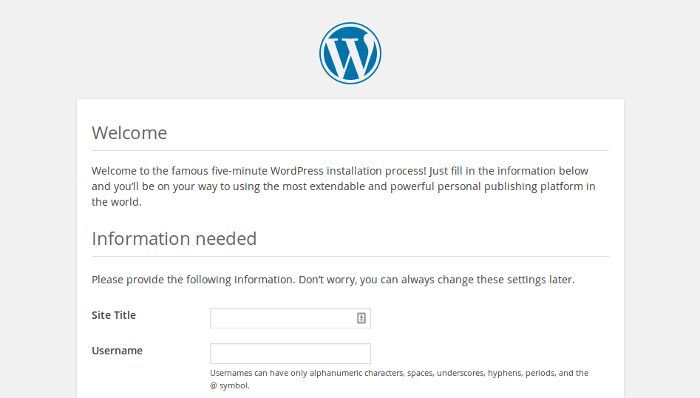Database Name: wordpress User Name: root Password: <YOUR PASSWORD> Database Host: localhost Table Prefix: wp_