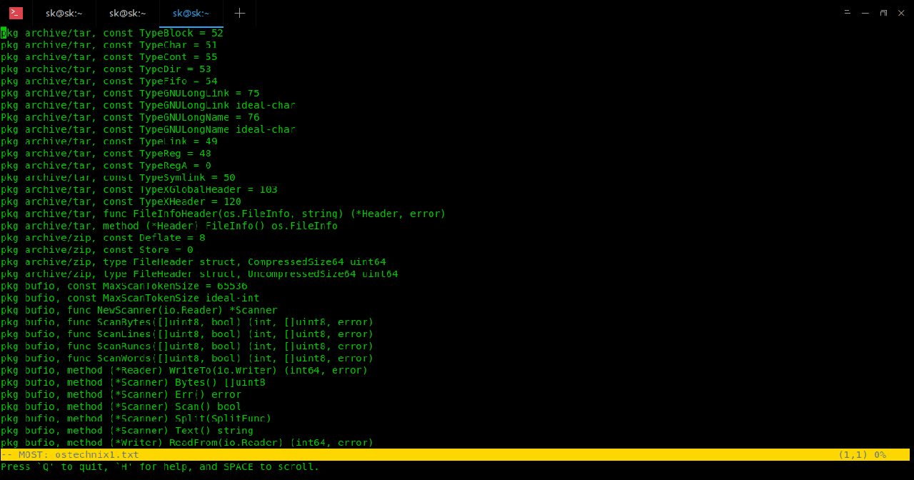 most 同样是一个终端阅读工具,而且比 more 和 less 的功能更为丰富。most 支持同时打开多个文件。你可以在打开的文件之间切换、编辑当前打开的文件、迅速跳转到文件中的某一行、分屏阅读、同时锁定或滚动多个屏幕等等功能。在默认情况下,对于较长的行,most 不会将其截断成多行显示,而是提供了左右滚动功能以在同一行内显示。