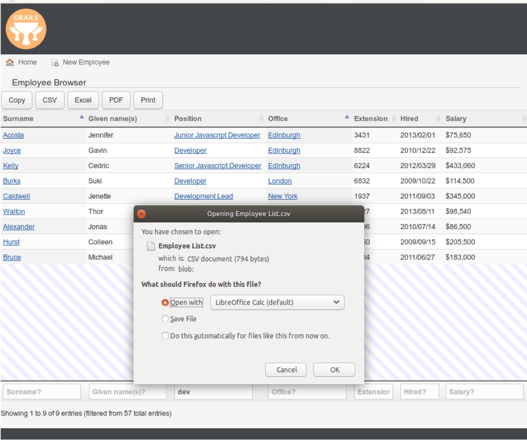 但该员工信息浏览器功能也是有限的。例如,如果想查找 “position” 信息中包含 “dev” 的员工该怎么办?如果要组合排序,以姓氏为主排序关键字,“office” 为辅助排序关键字,该怎么办?或者,你需要将已排序的数据导出到电子表格或 PDF 文档以便通过电子邮件发送给无法访问浏览器的人,该怎么办?