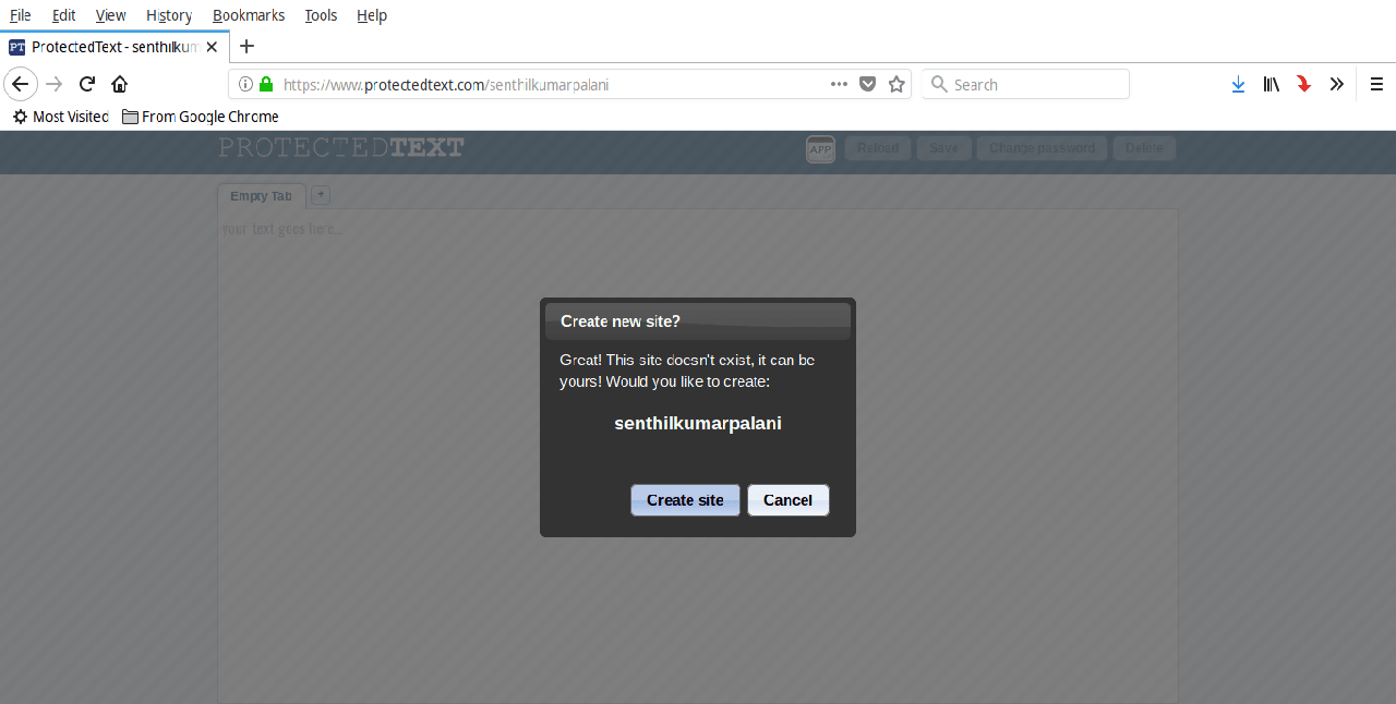 访问 https://www.protectedtext.com/ 这个链接,就可以打开 ProtectedText 页面了(LCTT 译注:如果访问不了,你知道的)。这个时候你将进入网站主页,接下来需要在页面上的输入框输入一个你想用的名称,或者在地址栏后面直接加上想用的名称。这个名称是一个自定义的名称(例如 https://www.protectedtext.com/mysite),是你查看自己保存的笔记的专有入口。