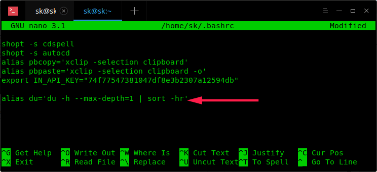 这个命令将会查找当前工作目录下的各个子目录占用的磁盘大小,并按照从大到小的顺序进行排序。这个命令有点长。我们可以像下面这样轻易地为其创建一个 别名: