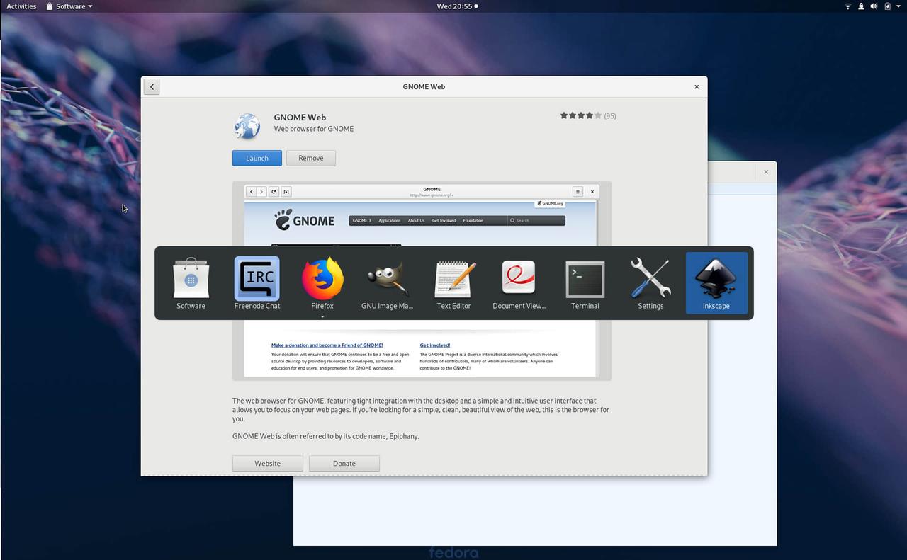 GNOME Web 未包含在默认的 Fedora 安装中。要安装它,请在软件中心搜索 “web”,然后安装。