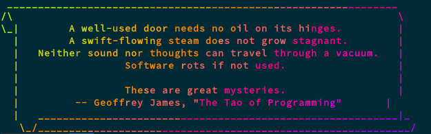 你可以传递给 lolcat 一些参数。这里不再赘述,我建议你访问 lolcatGitHub 页面 或者在终端输入 lolcat --help 了解。但一般来说,它们能设置彩虹的传递和频率,以及我个人最喜欢的动画。谁不喜欢终端的彩色动画输出呢?让我们再试一次,用一个不同的边框(当然是以猫为主题)和一句在我的格言列表中的适合猫的句子。