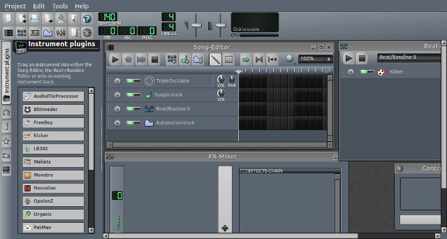 我们的两个音乐家使用多用途的现代音乐创建工具 LMMS。它带有一个绝妙的采样和效果库,以及多种多样的灵活的插件来生成独特的声音。LMMS 的学习曲线令人吃惊的低,在某种程度上是因为其好用的节拍/低音线编辑器。