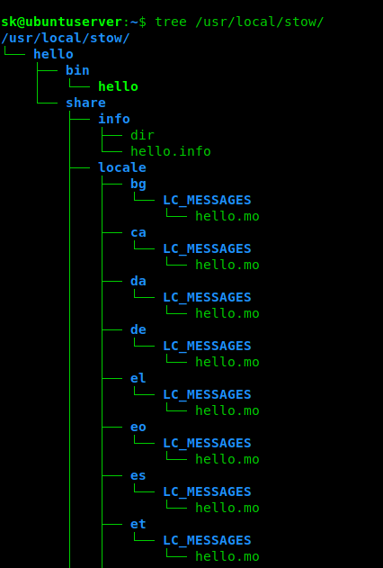 看,hello 这个程序已经安装在 /usr/local/stow/hello/ 下。同样地,所有的包都将保存在它们对应的目录之下。