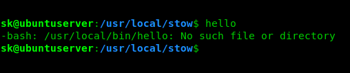 就这样。hello 这个程序就已经安装在 /usr/local/stow/hello/ 这个位置了。你可以使用下面的 ls 命令确认一下。