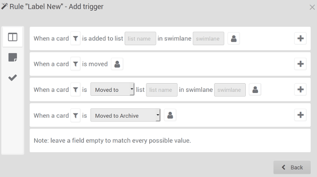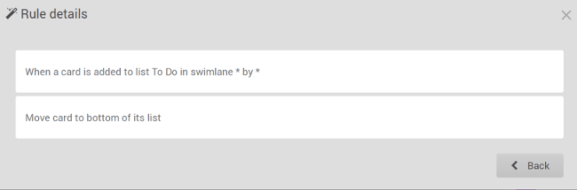 Wekan 的独到之处在于它的内置规则。虽然其他的看板软件支持 邮件更新 ,但 Wekan 允许用户自行设定触发器,其触发条件可以是卡片变动、清单变动或标签变动等等。