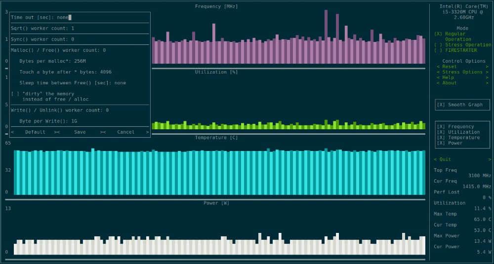 以 root 身份运行 s-tui 时,当压测所有 CPU 核心时,可以将 CPU 发挥到最大睿频频率。它在后台使用 Stress 压力测试工具,通过对系统施加某些类型的计算压力来检查其组件的温度是否超过其可接受的范围。只要计算机稳定并且其组件的温度不超过其可接受的范围,PC 超频就没问题。有几个程序可以通过压力测试得到系统的稳定性,从而评估超频水平。