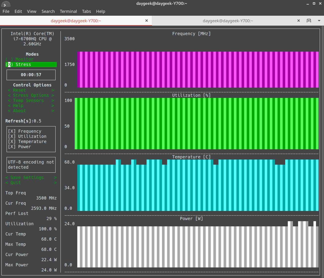 s-tui 是一个用于监控计算机的终端 UI。s-tui 可以在终端以图形方式监控 CPU 温度、频率、功率和使用率。此外,它还显示由发热量限制引起的性能下降,它需要很少的资源并且不需要 X 服务器。它是用 Python 编写的,需要 root 权限才能使用它。