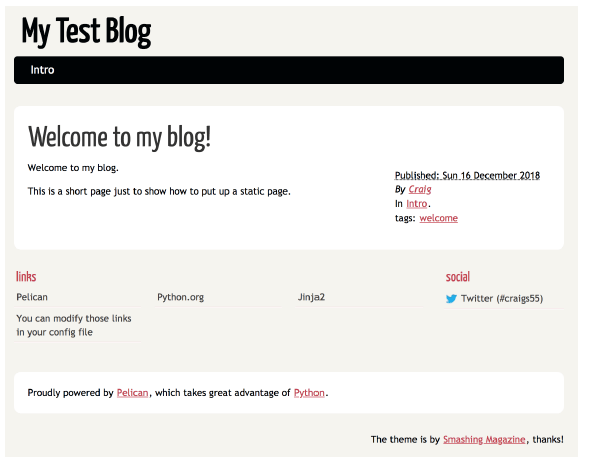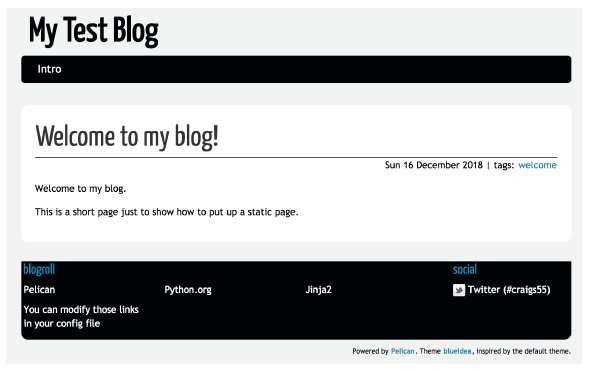 $ pwd /Users/craig/tmp/pelican/test-site $ cat content/welcome.rst Welcome to my blog! ################### :date: 20181216 08:30 :tags: welcome :category: Intro :slug: welcome :author: Craig :summary: Welcome document Welcome to my blog. This is a short page just to show how to put up a static page.